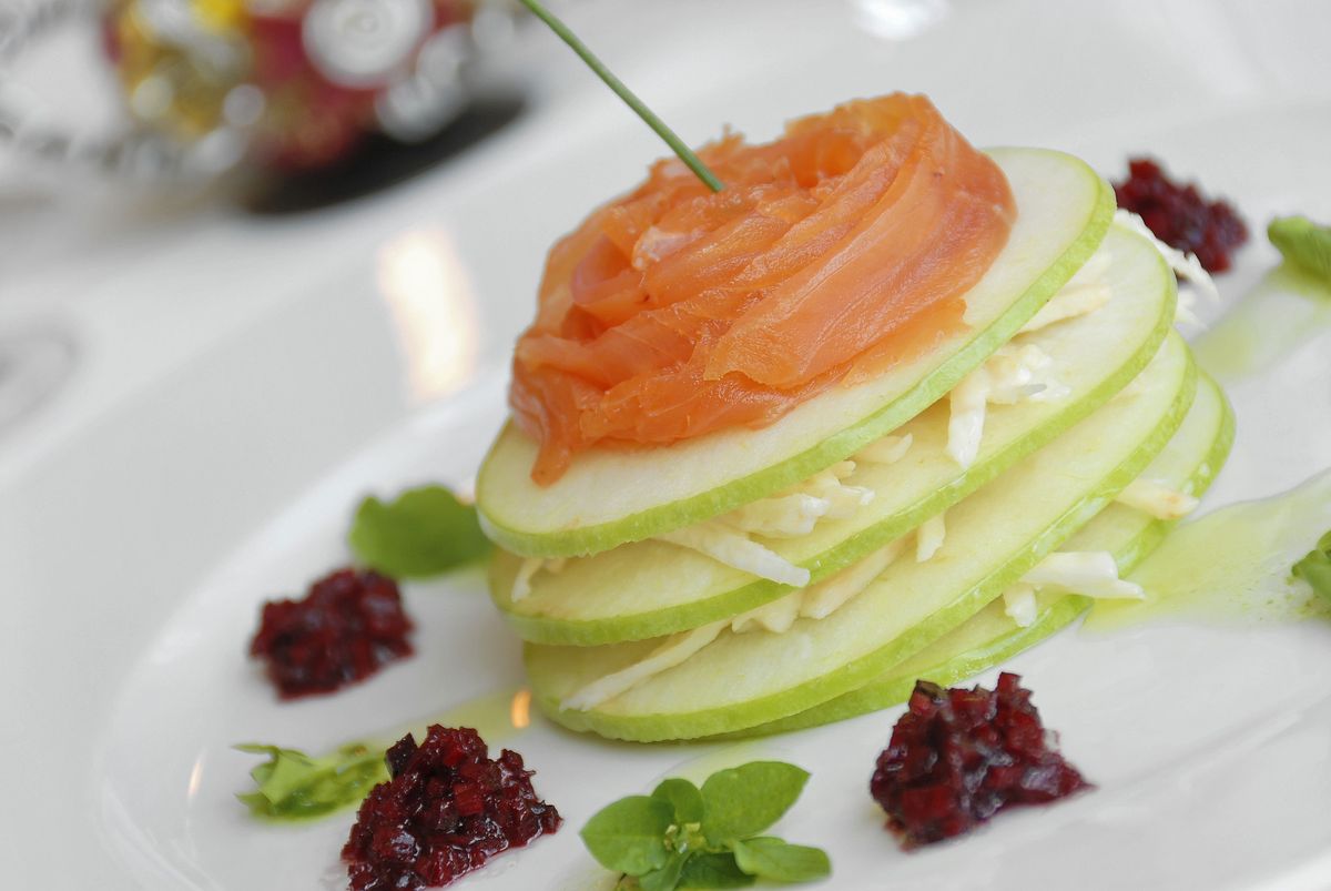 Beef Bourguignon rouelle, Pink Radish Pickles, Celeriac mousseline, Gourmet Vinaigrette |