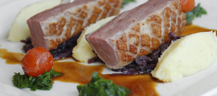 Pan-fried Venison Steak, Grand Veneur sauce, Almond Polenta, braised red Cabbage |